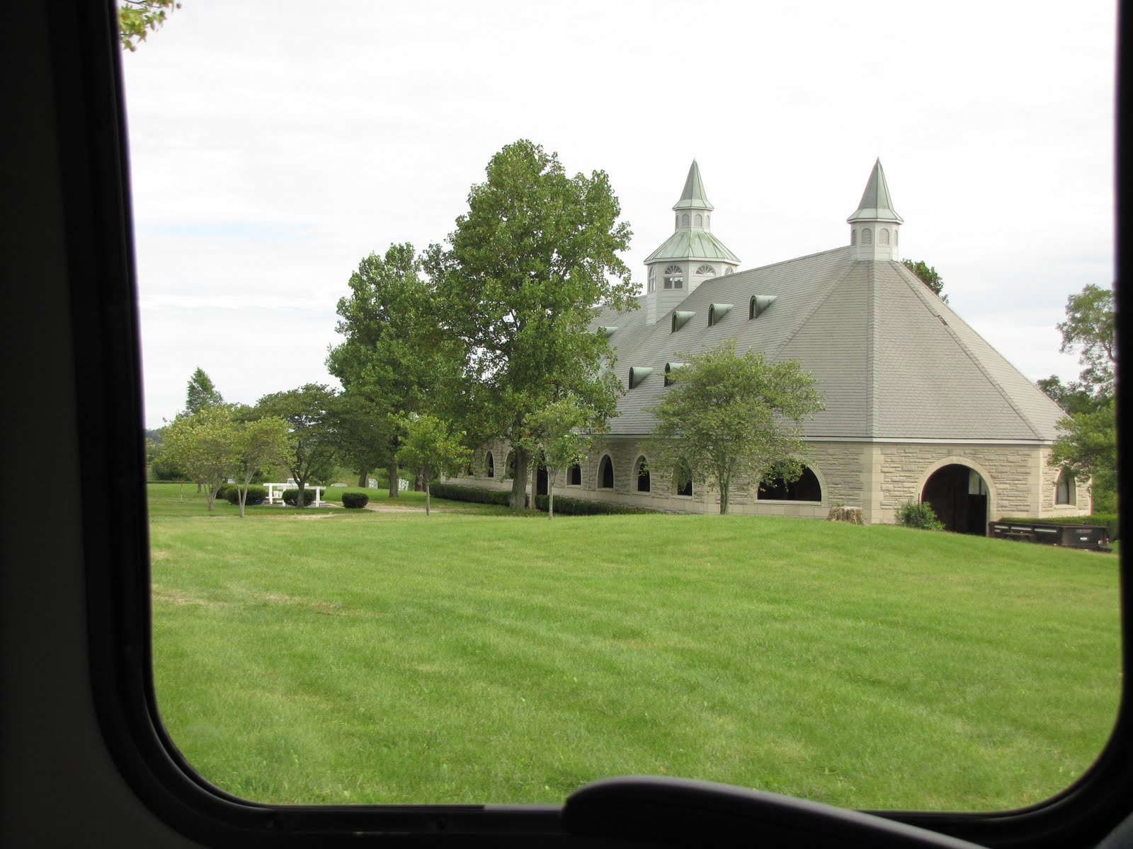 Vi hoppar in i bussen och Larry kör norrut med km efter km med trästaket, och tjusiga gårdar, och hästar! Vägarna blir smalare och gårdarna blir större! Vi kör in genom grindarna på ett stuteri som heter Donamire. Det har byggts och ägs av en familj som började från scratch. Frun jobbade som skolfröken och mannen i byggbranchen och det gick så bra att de numera är ekonomiskt oberoende, har ett framgångsrikt stuteri och träningsstall, en dirttrack och en gräsbana samt enorma hagar och alla stall är byggda i kalksten. Frun jobbar numera med välgörenhet och mannen med sin hobby: Hästar!
