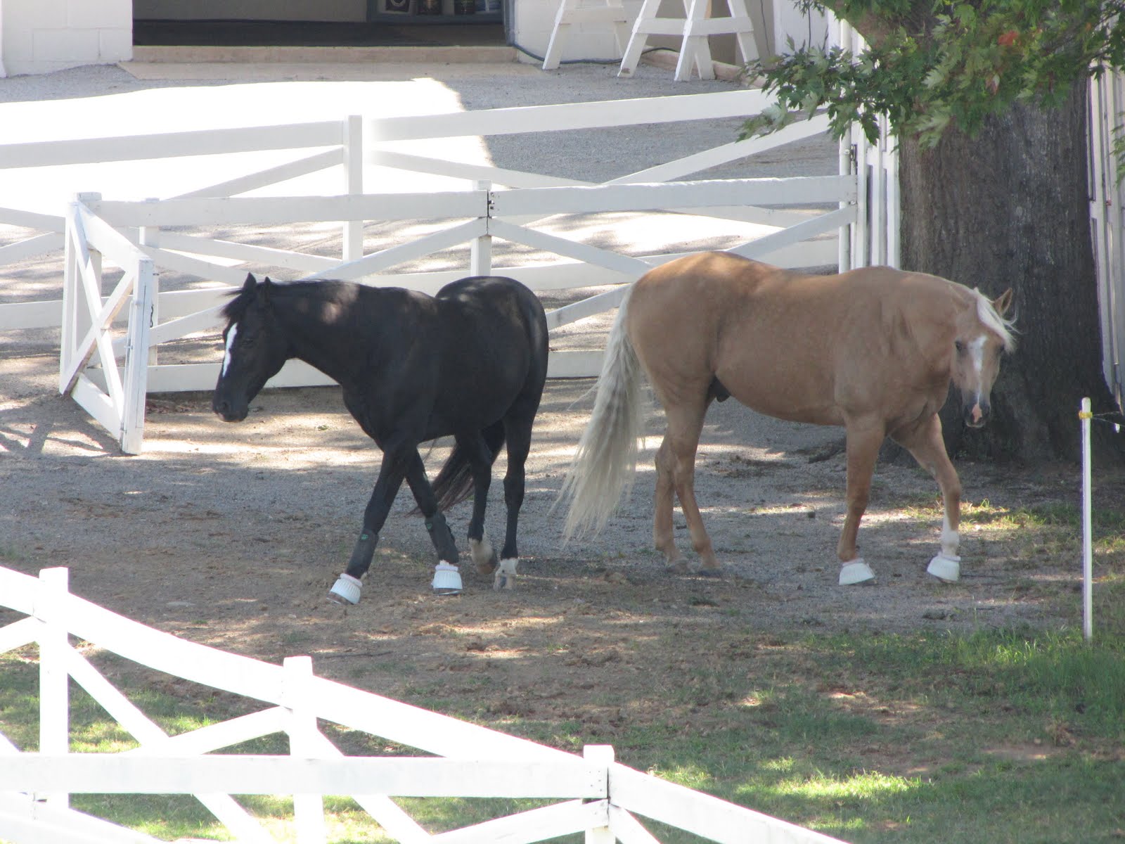 Bakom huset ett par stora hagar där det gick en palomino, en svart och en brun häst.