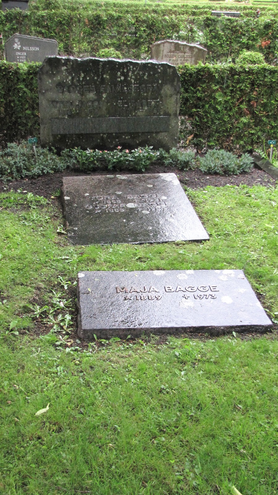 Emellertid körde vi till gravarna. Det är en stor kyrkogård. Det regnade tillochfrån ganska mycket, men vi hade paraplyer och hittade både far Sten-Jacob o mors Elisabeth, farfar Gustaf o farmors Tora, farfar brors Georgs (hans grav hade en speciell skylt som vissa personer som hade betydelse för Linköpings historia får: Han, (Georg) som på egen bekostnad satte vapen (trägevär) i ungdomens händer, ”gymnastiklärare” som övade marscher med ungdomarna i början av 1900-talet, gymnastiksalen ligger fortfarande 50 m från domkyrkan och 100 m från slottet, och storebror Mats har hans porträtt med stor mustache och uniform) och farfarfars, Pontus o farfarsmor, Sofie.