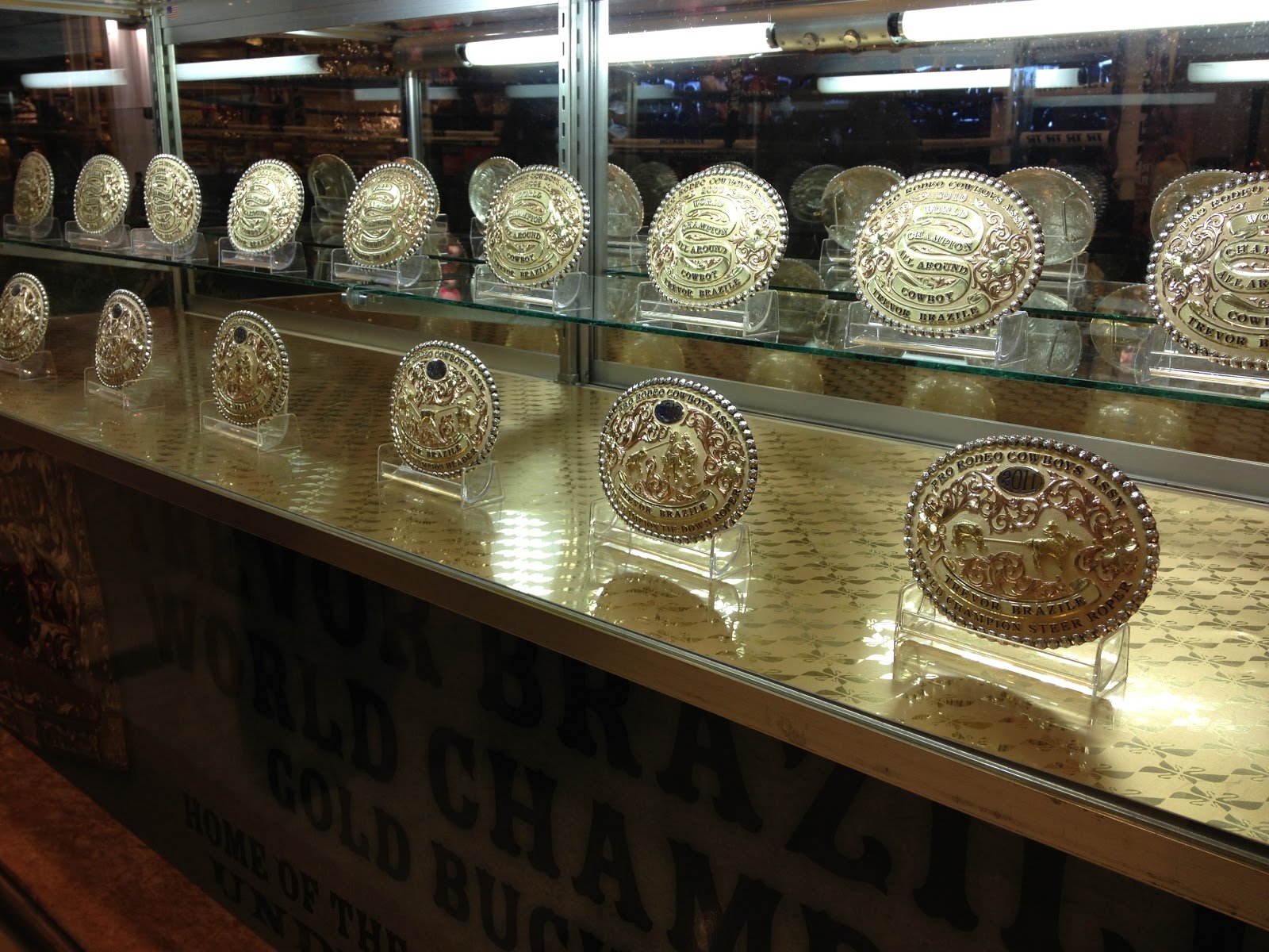 Han vet att det är små marginaler och att konkurensen är stenhård. Bl.a har hans favorithäst har varit skadedrabbad. Dom studerar även kalvarna som dom ska ”ropa” dvs fånga med lasso dels runt hornen, dels runt bakbenen på kortast tid. Fångar healern i teamet bara ena bakbenet på kalven kan det skilja på seger eller förlust för teamet. Trevors imponerande belt-buckle-samling som han visar i lobbyn på vårt hotell. Han har en egen monter där han skriver autografer, och alla hans championatsadlar hänger där också.