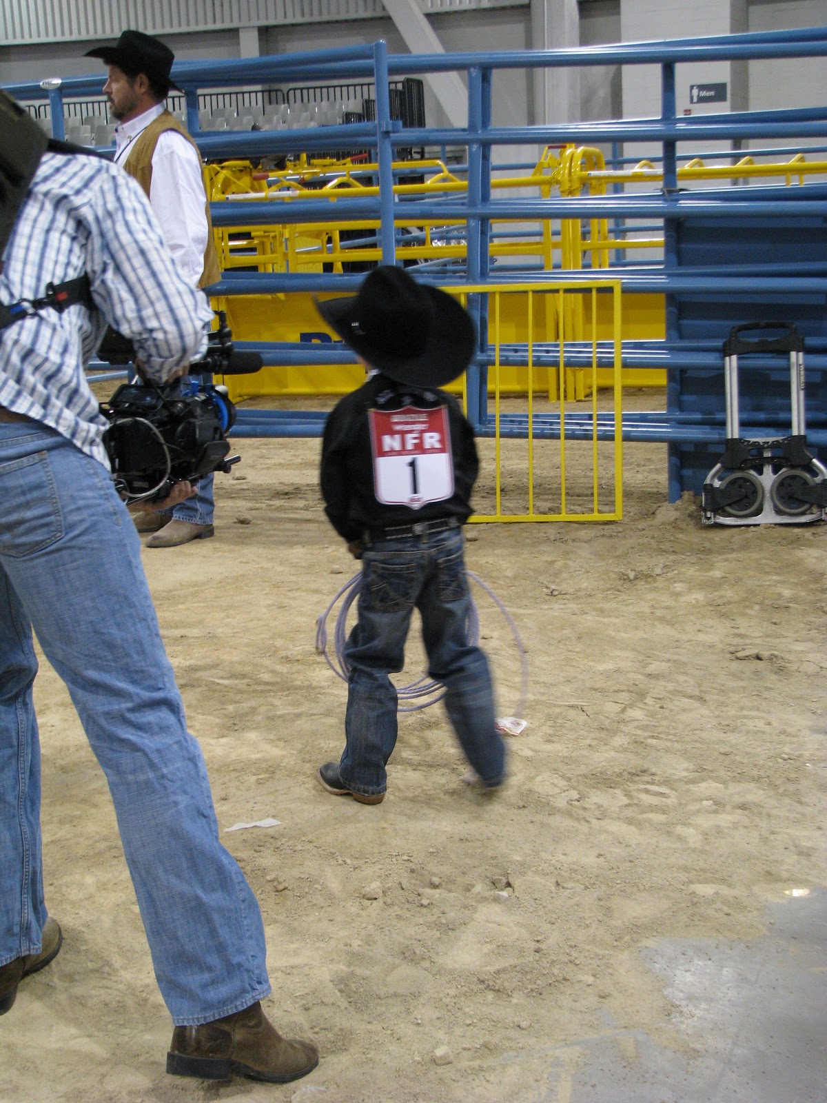 Tidigare i samma arena ser vi Trevor Braziles fru och två barn följas av minst två TV-kameror, men hans son är en riktig liten stjärna, exakt samma outfit som pappa, spexar vant med fotograferna och han ska vara med på Mutton bustin senare, barnens rodeo, där dom klamrar sig fast så länge dom kan i ullen på ryggen på ett stort får!