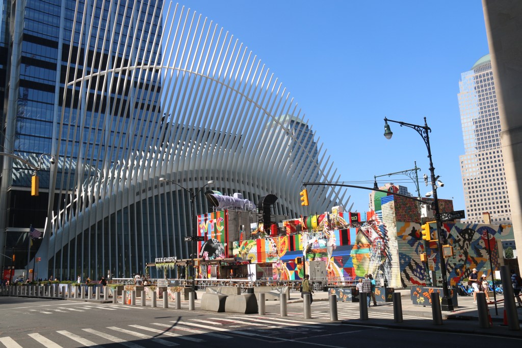 Idag tog vi tuben från 50th street ner till södra Manhattan och Ground Zero. Vi var i NY 2008, dvs 7 år efter att planen flög in i tornen, och då höll dom fortfarande på att röja. Hela platsen såg ut som en byggarbetsplats med höga plank runt. Nu har man gjort en stor minnesplats, en park och två vattenfall där tornen stod. Namnen på alla som dog finns ingraverade i kanten runt vattenfallen. Man har även byggt några skyskrapor runt platsen, samt ett enormt köpcenter, Oculus med tågstation och massor av butiker och restauranger. Oculus ser ut som ett gigantiskt val-skelett.