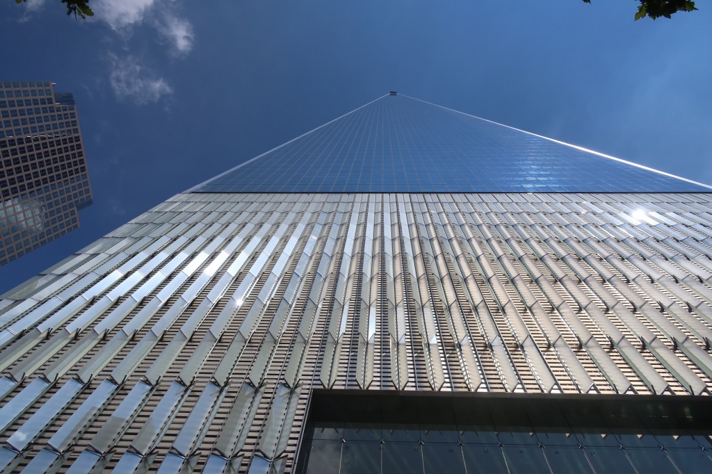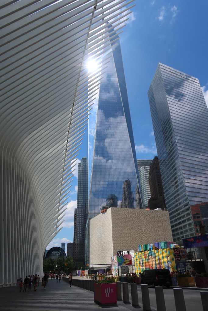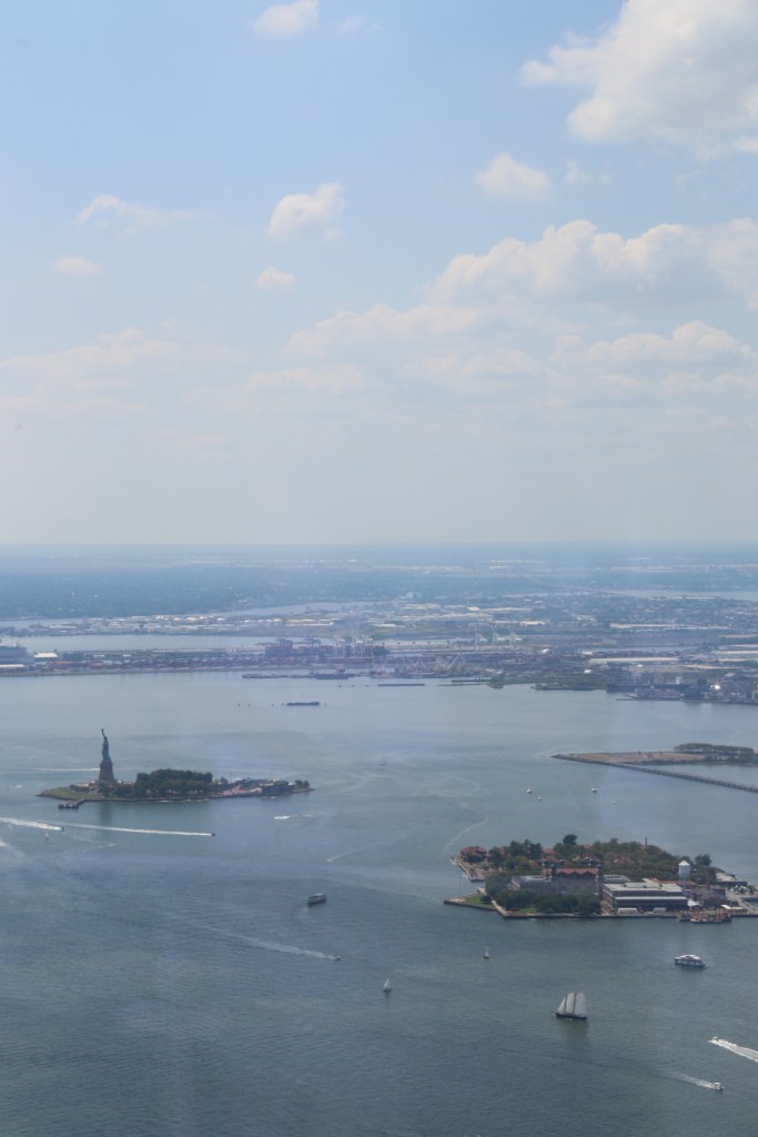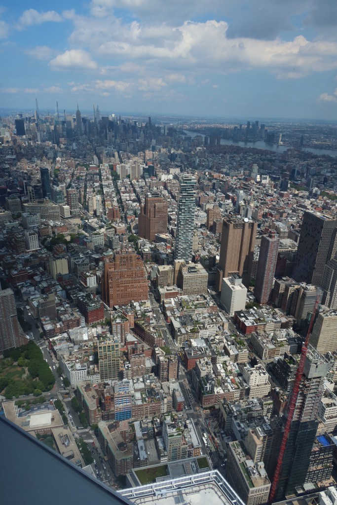 Ut i tropikvärmen igen, och vi bestämmer oss för att se på utsikten! Vi besöker världens sjunde högsta byggnad, högst i USA, den kallas One WTC och färdigställdes 2013. Den ligger bara ett par hundra meter från Ground Zero. Man tar hissen upp till 102:a våningen, 386 m upp. Där har man fantastisk utsikt åt alla väderstreck.