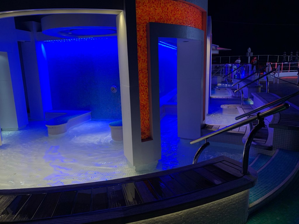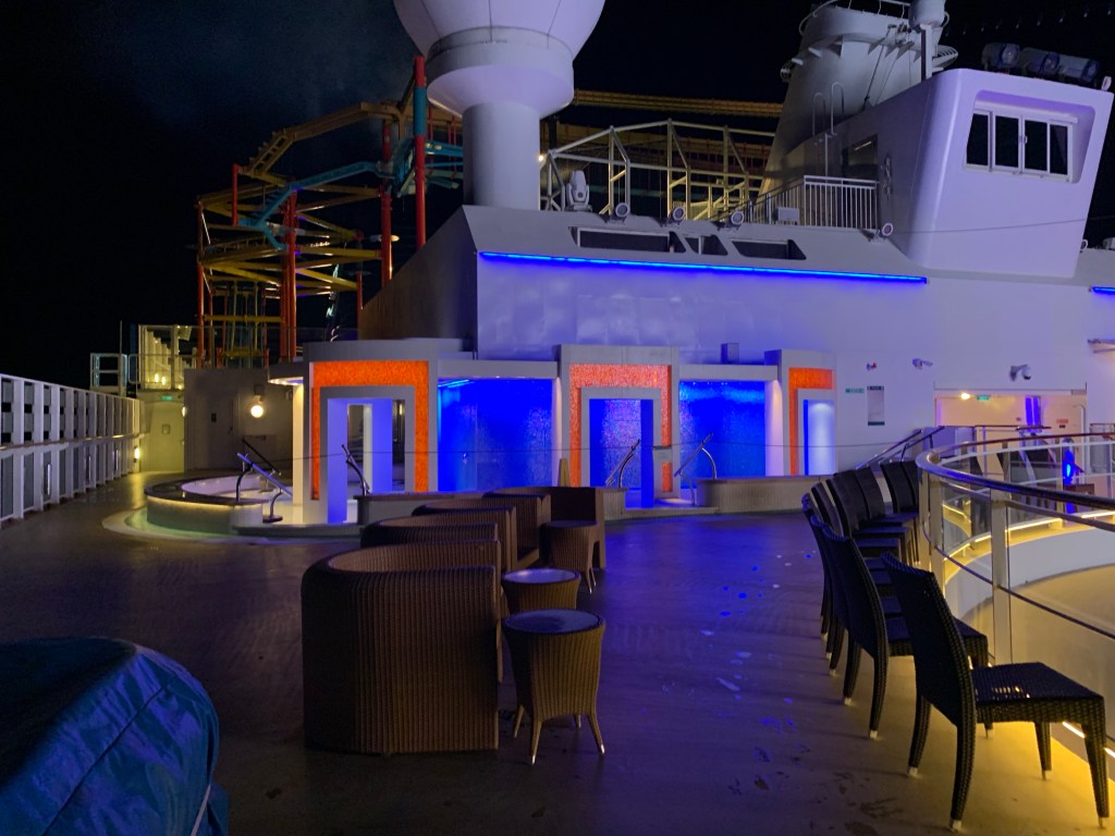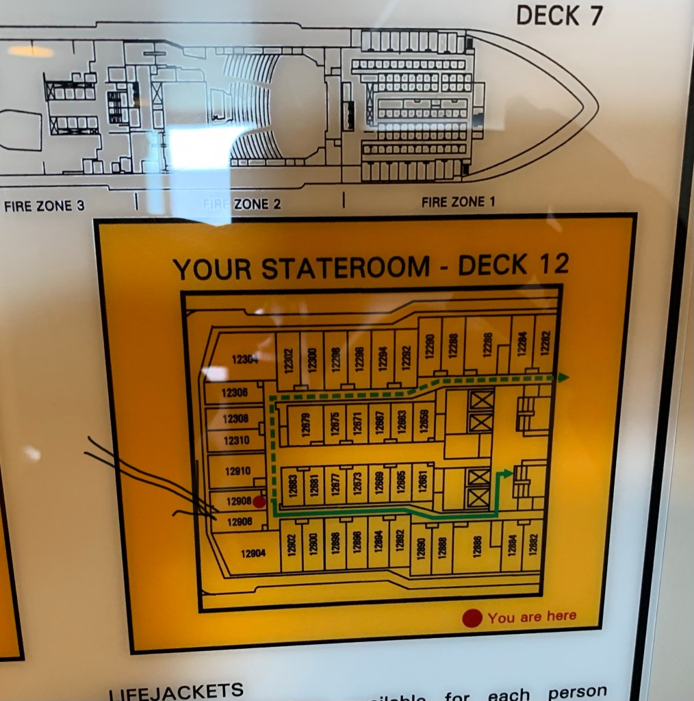 De lyxigaste hytterna ligger antingen lĂ€ngst fram i Heaven-avdelningen, eller pĂ„ hörnen lĂ€ngst bak. Vi bokade pĂ„ 12 dĂ€ck. Man ska inte bo högre upp pĂ„ AFT, för dĂ„ störs man av partyavdelningen som ligger pĂ„ 14 dĂ€ck. Vi hörde inte nĂ„gonting dĂ€rifrĂ„n mer Ă€n lite dunka första natten. Vi hörde knappt motorerna heller nĂ€r dörren var stĂ€ngd. Men det var mysigt och sövande att höra havet och motorerna. Vi hade inte lĂ„ngt till hissarna, kanske 20 meter. 8 hissar i aktern och 8 hissar i fören. SĂ€llan nĂ„gon större vĂ€ntetid.đđ