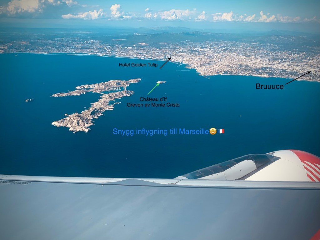 2:40 tog flygningen och Piloten var i god tid till landning, så vi fick en spektakulär, kvälls-solig inflygning med hela Marseille med kryssningsfartyg och öarna utanför Marseille med Chateau d’If, fortet där Greven av Monte Cristo satt fängslad, och en maffig bergskedja i bakgrunden. Pampigt!
