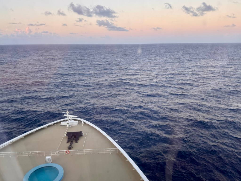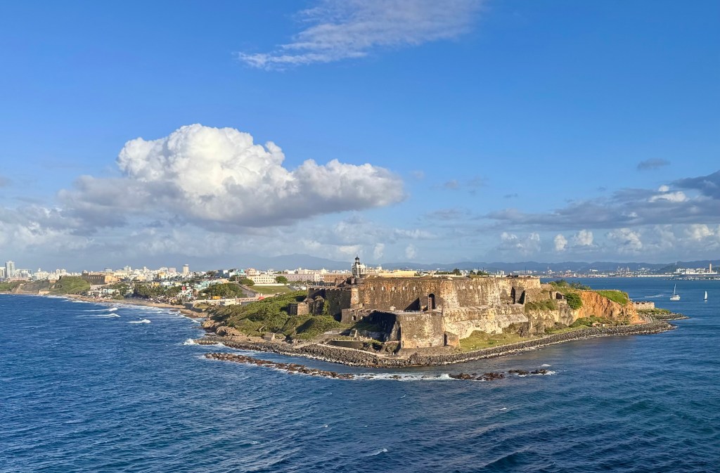 Skeppet stÀvar ut frÄn San Juan-viken, och vi rundar forten med sin söta vakttorn och ser staden försvinna i fjÀrran. Nu ser vi inte land igen pÄ 7 dygn, dÄ vi anlÀnder till Funchal, Madeira söndag 26:e april.