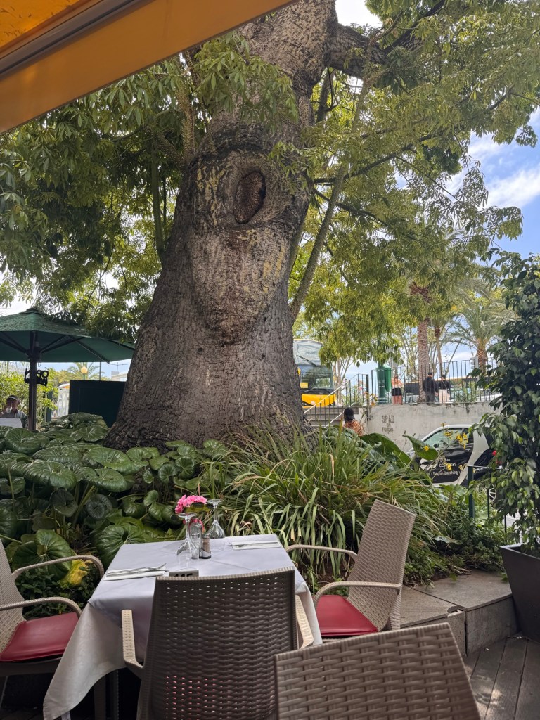 Nu blir det lunch, och vi har utsikt mot marinan och vÄrt skepp. Vi delar en fisk och skaldjurstallrik, fantastiskt gott. Precis bredvid vÄrt bord stÄr ett enormt trÀd. Det Àr ett Baobab-trÀd som kan bli ett par tusen Är gammalt, detta Àr dock bara runt 200 Är men mÀter ett par meter i omkrets.