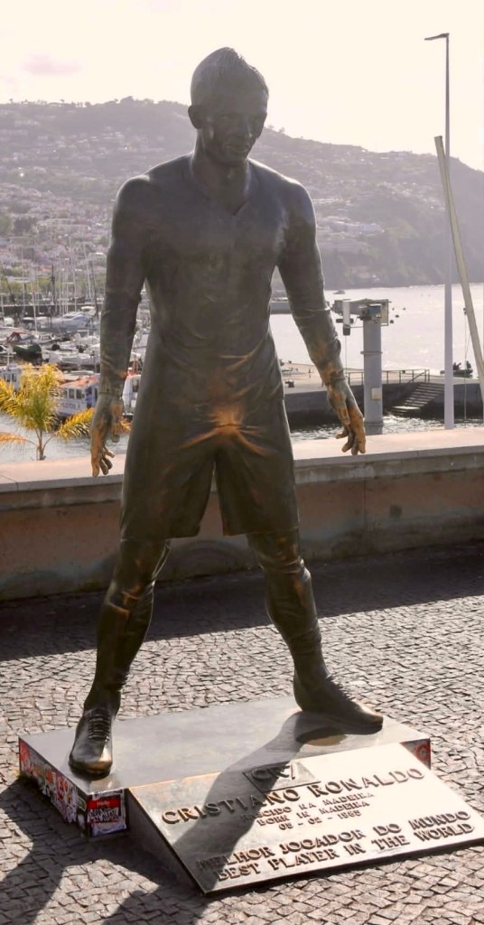 Vi passerar brons-statyn av Madeiras hjĂ€lte Cristiano Ronaldo. Han kan inte vara speciellt nöjd med sitt utseende pĂ„ den, stackaren, den Ă€r minst sagt grotesk, vilket han inte Ă€r i verkligheten. DĂ€remot har han en fin âbulaâ som mĂ„nga har gnuggat, för den Ă€r vĂ€ldigt blank och fin.